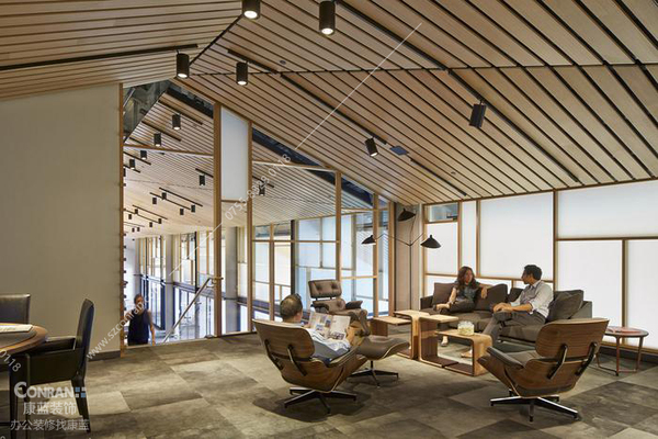 loft辦公室裝修設(shè)計(jì)風(fēng)格強(qiáng)調(diào)空間的透明性和開放性,傳統(tǒng)的不同職能部門之間的隔閡在loft辦公室空間設(shè)計(jì)中被打破:利用靈活多變的現(xiàn)代辦公家具,根據(jù)人員配置進(jìn)行功能上的組合,打造開放式的辦公空間,促進(jìn)群體中個體間的交流互動。交流空間的形式可以有多種實(shí)現(xiàn)方式:比較常見的是寬敞的過道上配備小型的圓桌和座椅,在開放辦公空間中設(shè)計(jì)出小型的“沙龍”;或在茶水間、閱覽室等附屬空間中擺放小型桌椅,賦予其交流空間的功能。
