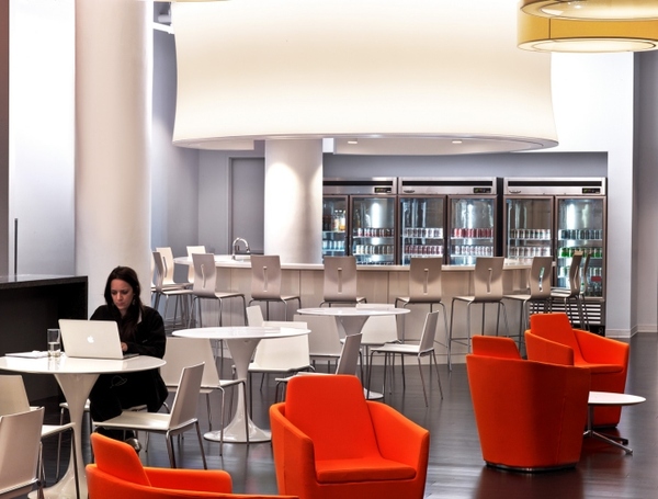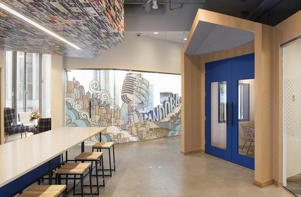 開放性的辦公區(qū),設(shè)計(jì)師使用餐廳質(zhì)感的訂制家具,取代以往的OA辦公家具,讓員工作業(yè)可以更加舒適愜意。設(shè)計(jì)師特別為業(yè)主規(guī)劃斜角天花及專業(yè)隔音系統(tǒng),讓每次聆聽音樂都是一場(chǎng)享受。