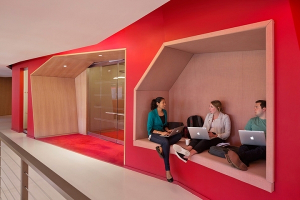 其它特殊功能區(qū)包括開闊的中庭、休閑區(qū)、咖啡吧、酒館式空間等,這樣的設(shè)計旨在促進大家更多的聚集和互動交流,增加內(nèi)部的凝聚力,培養(yǎng)文化和知識的共享理念。