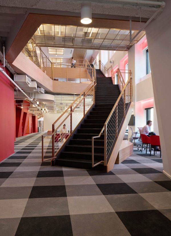 為了消除樓層間的孤立感,設(shè)計師創(chuàng)建一個活力動態(tài)的工作空間,打造了共享中庭并增加一座連接各個樓層的中庭樓梯。設(shè)計以枝繁葉茂、盎然生機的“大樹”為概念,蓬勃伸展至各個樓層,衍生出本案的幾何形空間裝飾語言,由中央核心向周邊與頂面呈樹枝狀蔓延擴展。