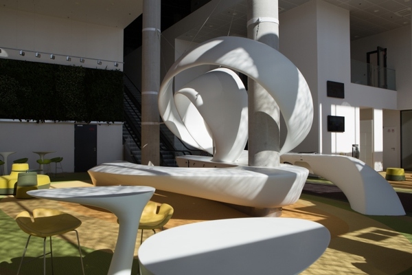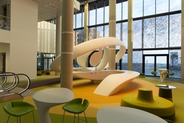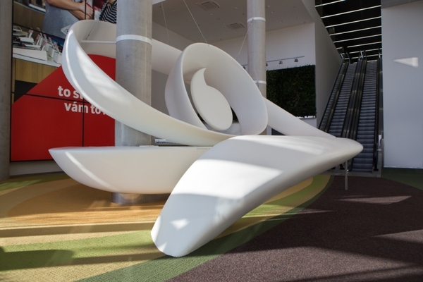 沃達(dá)豐公司期待的,是一個(gè)能夠展示出燦爛明天,并且能夠表明公司對未來前景信心的入口大廳。這個(gè)非同一般的大廳里,*引人注目的使那個(gè)三層樓高的藝術(shù)雕塑作品。