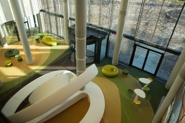 大廳和一樓之間的實(shí)體連接,是通過扶手電梯來完成的。大廳的南面采用玻璃幕墻,跟墻外的街道形成一種交互。中央那個(gè)形狀獨(dú)特的前臺接待桌,把大廳整個(gè)平面的布局規(guī)劃的像是一幅圖畫。設(shè)計(jì)師專門使用一些能夠給人帶來柔軟感覺的材料,比如人造的草皮,還有那些好像是生長在柱子和家具上的苔蘚和地衣。