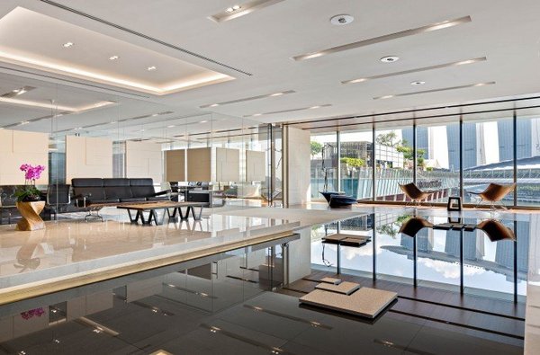 其辦公室裝修設(shè)計(jì)寧靜優(yōu)美、夢幻仙境、根植于亞洲的文化特征、精神文化的傳達(dá)、漂浮于水上的玻璃會議室、視覺體驗(yàn)。