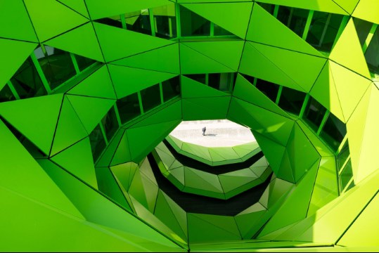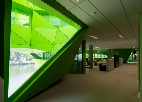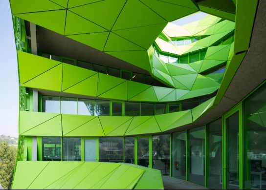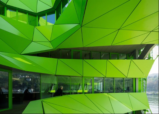 近來,法國里昂海港區(qū)出現(xiàn)了一幢披著綠色外衣的大廈,它就是歐洲主流媒體之一的EuroNews新總部大樓。輕型的釉質(zhì)幕墻,覆有不規(guī)則的多孔鋁制包層。來源于河水顏色的靈感,讓綠色滲透到了辦公室的“骨血”中。
