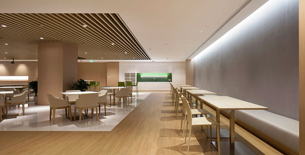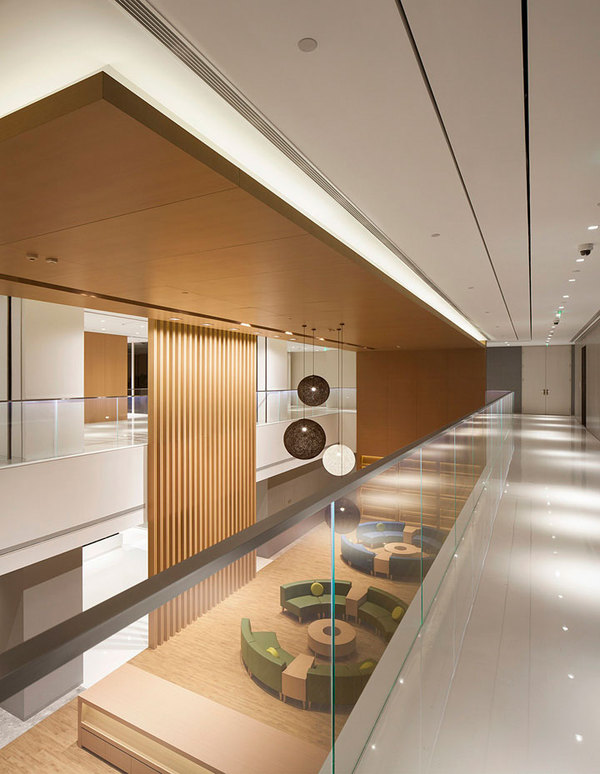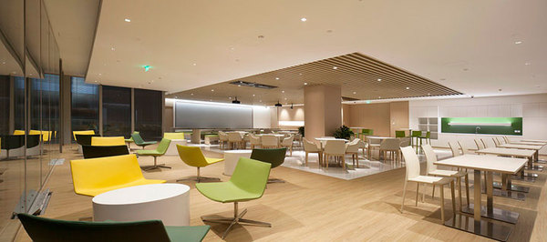 新的辦公中心非常注重員工的休閑空間的設(shè)置,西側(cè)挑空層設(shè)置了大型員工書吧 及休閑區(qū)域。