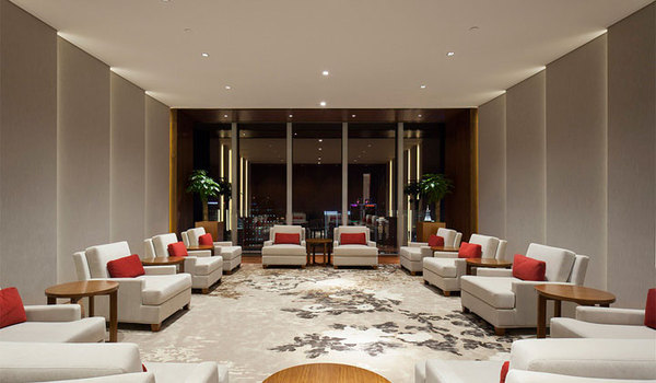 接待區(qū)的造型整體簡潔**視覺沖擊,正面縱向的木色格柵代表造紙業(yè)的原材料木材。