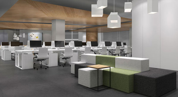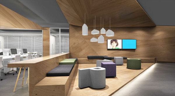 辦公區(qū)域的設(shè)計(jì),設(shè)計(jì)師主要為了突出交流功能,以固定的工作位置來(lái)增強(qiáng)團(tuán)隊(duì)合作的便利性。