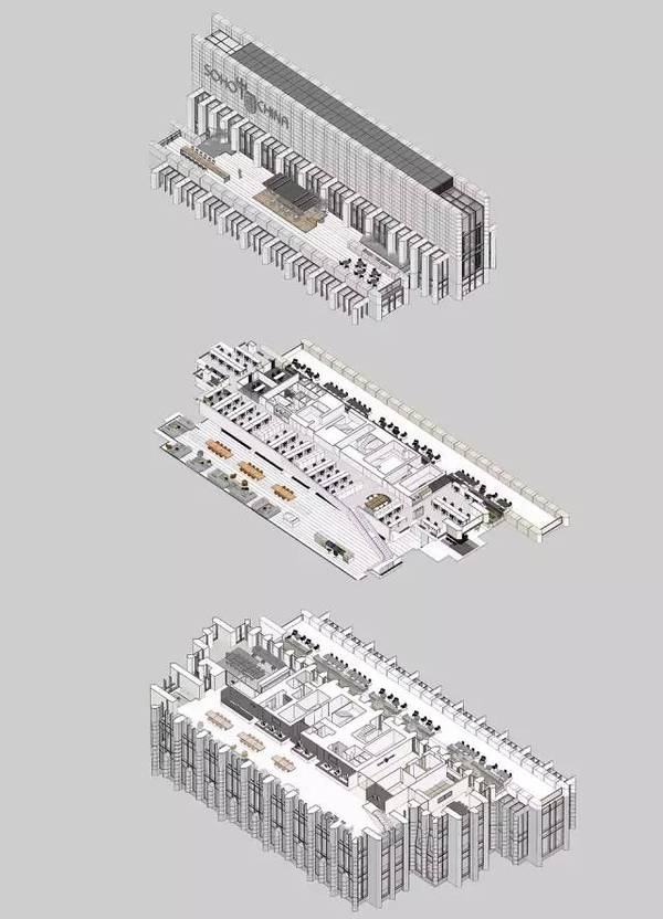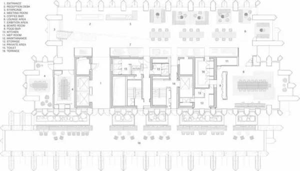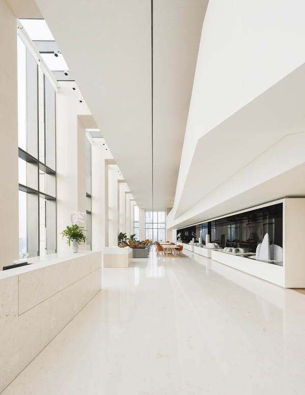室內(nèi)和室外同時(shí)使用了簡(jiǎn)化的米黃色的石材,作為對(duì)于外灘老上海建筑的一種追溯,還使用仿佛能把人帶入未來(lái)的簡(jiǎn)潔而堅(jiān)硬的白色墻面。此外還有許多的小細(xì)節(jié):電梯廳附近45度的傾角;奶油色的石材使得空間看上去更加開闊;明亮的光照,在上海的古老和現(xiàn)代之間尋找到平衡。