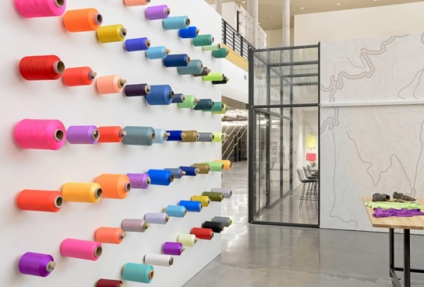 因?yàn)槭沁\(yùn)動(dòng)服飾研發(fā)公司,因此類似面料、橡膠、紗線、還有鞋子等物品即需要儲(chǔ)存的地方,也要便于隨時(shí)觀摩。儲(chǔ)物柜是一種解決方案,但O+A提出更好的創(chuàng)新方案。當(dāng)設(shè)計(jì)團(tuán)隊(duì)在現(xiàn)場(chǎng)考察的時(shí)候被儲(chǔ)物盒中靚麗的紗線色彩所吸引。一個(gè)個(gè)漂亮的線軸被精心裝飾于墻面上,形成一道裝置藝術(shù)墻。