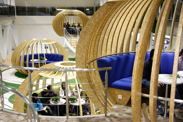 而關(guān)于大家**奇的,除了它本身的膠囊造型之外,就是這些“鳥籠”的材質(zhì)了;這些坐落于竹木地板上的“未來對(duì)撞機(jī)”,用麥秸板——一種可再生的農(nóng)業(yè)材料,秉承可持續(xù)發(fā)展的健康辦公環(huán)境的創(chuàng)新理念,這也是在2010年上海世博會(huì)展館使用的主要材料。100%優(yōu)質(zhì)原材料的麥秸板,采用無甲醛膠粘劑(P-MDI)通過熱壓工藝低碳、環(huán)保、健康。因?yàn)槭恰傲隳尽辈牧?,還有助于減少森林砍伐,這反過來又進(jìn)一步的積極影響我們呼吸的空氣質(zhì)量。總而言之,這樣的辦公室裝修設(shè)計(jì)無論是在環(huán)保上還是實(shí)用上都給我們做出了很好的表率。