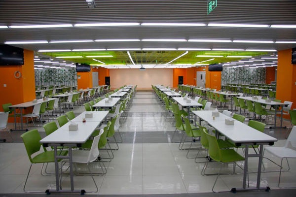 辦公室餐廳的設(shè)計(jì)沿用了整齊劃一的一貫風(fēng)格,值得注意的是360總部餐廳的墻面采用的是亮橙色的色調(diào),跟色彩心理學(xué)的理論不謀而合,因?yàn)槌壬鬃寙T工產(chǎn)生饑餓感而胃口大開!