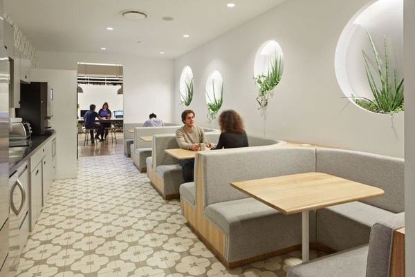 帶有休息室的柜臺式會議空間和野餐桌式會議室。