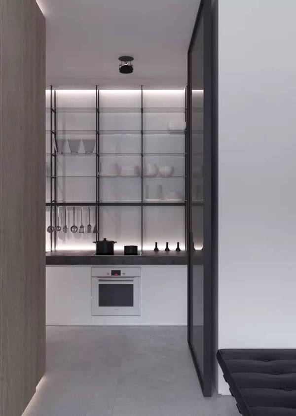 簡潔利落的廚房,表面沒有多余的裝飾,但金屬感的設(shè)計酷勁兒十足,在材質(zhì)的沖撞中凸顯質(zhì)感。