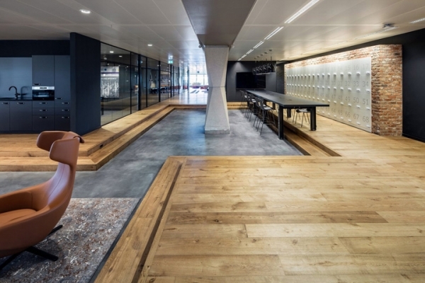 高低錯(cuò)落的地面豐富了空間形態(tài)。溫暖的木色、混凝土地面、暗色系墻面和家具,簡(jiǎn)潔的材質(zhì)對(duì)比卻營(yíng)造出豐富的視覺效果和時(shí)尚辦公空間。開放辦公區(qū)沿窗而設(shè),遠(yuǎn)處蔥蘢美景盡收眼底。