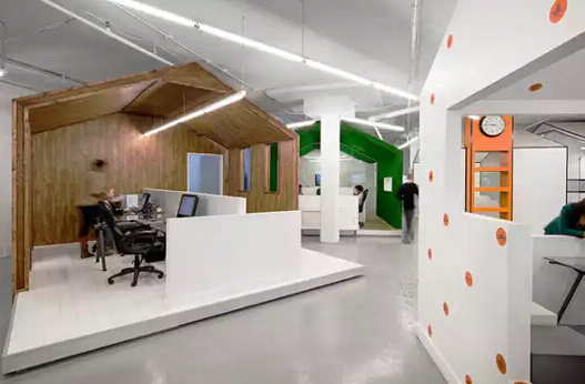 創(chuàng)意辦公室裝修,*主要的是與眾不同的體現(xiàn),進(jìn)入辦公室給人一種眼前一亮的感覺。考慮到陽光朝向?qū)k公環(huán)境的影響,室內(nèi)桌子和電腦顯示器遮蔽在靠南的陰影下,另一側(cè)的墻壁擺放各種物件,亂中有序。設(shè)計(jì)師特別通過色彩對(duì)透明開放和封閉的兩部分進(jìn)行對(duì)比,室內(nèi)加上明快的顏色,白色、黃色、綠色。透明弧形窗的部分,其室內(nèi)的地面和墻面是鮮亮的黃色與綠色,與室外的色彩一致,生機(jī)勃勃。
