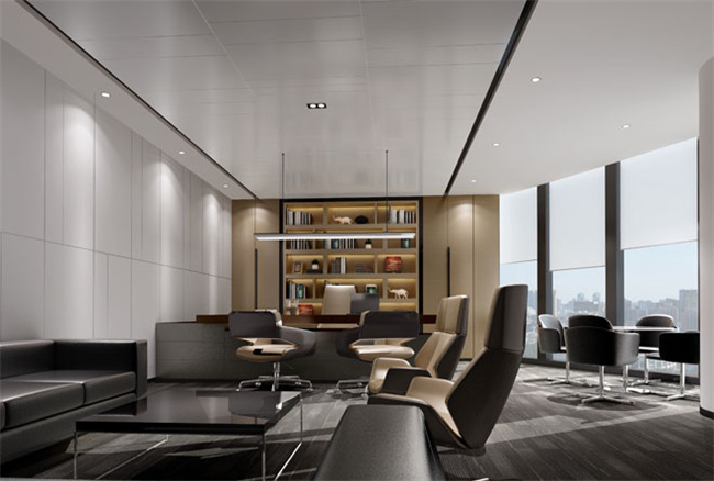 3、集團總裁、總經(jīng)理等領導辦公室裝修設計直接代表著企業(yè)的形象和實力。案例中展示的總裁辦公室為新中式風格,總裁辦公室既有辦公區(qū)也有接待區(qū),方便了總裁接待客戶。新中式風格既凸顯了總裁的儒雅,也體現(xiàn)了企業(yè)務實、內(nèi)斂的特性。