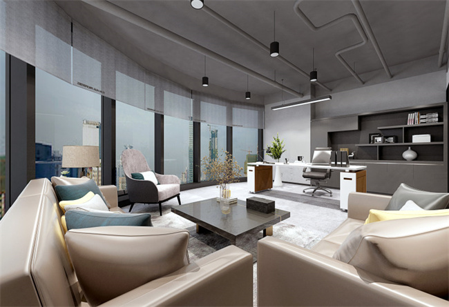 5、董事長辦公室裝修設計,整個空間格調(diào)采用灰色調(diào),形成沉穩(wěn)商務的搭配,功能分區(qū)劃分明顯,休息待客與辦公相輔相成,頂部框架結構,為整個空間增添了一絲不羈。