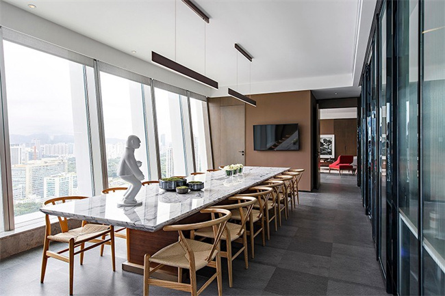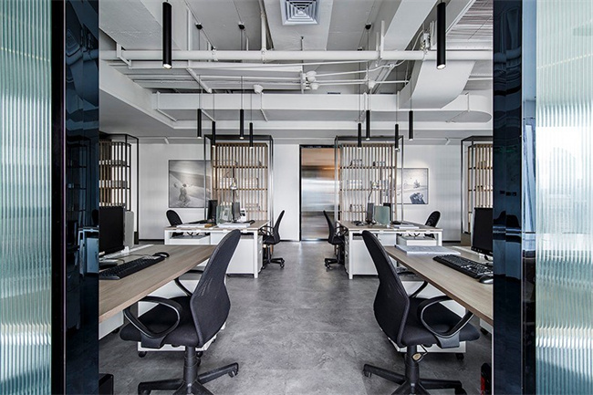 1、極簡風(fēng)格550平辦公室設(shè)計(jì)案例:空間的形式做到了極簡,沒有任何多余裝飾,橡木豎向格柵、乳膠漆墻、半透明玻璃移門、平頂天花、開放式天花、橡木飾面的柜子及門扇概括了所有的造型。通過這些簡單的形式,以營造出通透流暢的空間,空間可以通過格柵門及玻璃門開放或密閉,從而滿足不同的使用需求。豎向格柵使得空間具有了多層次的穿透與流動(dòng),讓路徑串聯(lián)的每一個(gè)獨(dú)立空間可以借由半透明玻璃門產(chǎn)生視線上的交叉,而視覺的穿透還保證了空間的連續(xù)性。走廊和辦公區(qū)用格柵書架作為隔斷,整齊疊放的書籍與辦公桌上的植物使辦公環(huán)境更加輕松舒適。