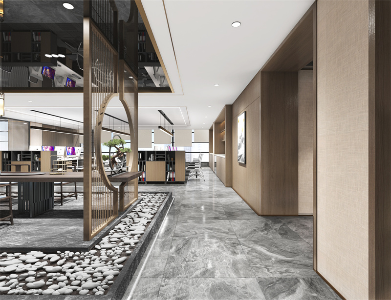3、新中式開敞式辦公區(qū)設(shè)計(jì)效果圖